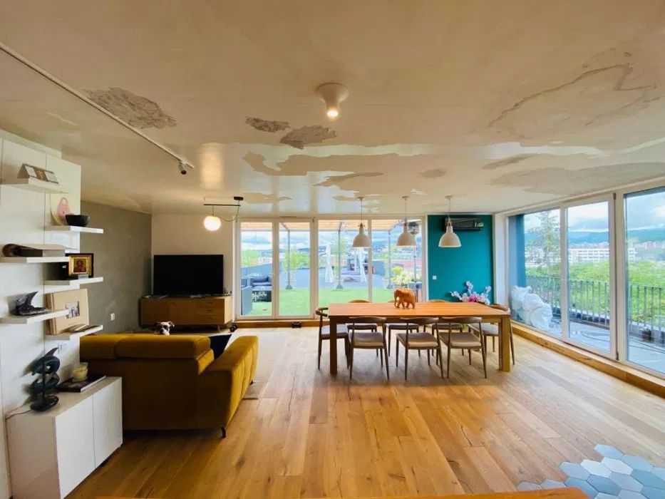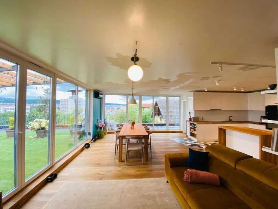 Elite ofera spre vanzare apartament cu 3 camere in cartierul GRIGORESCU. Imobilul este situat in zona Grigorescu, in constructie noua, este cu trecere si are suprafata utila de 130 mp. Imobilul are 2 bai, un balcon si este orientat est vest. Este finisat modern, are parchet laminat, faianta/gresie moderna, tamplarie exterior termopan, tamplarie interior lemn, usa intrare metalica. Locuinta are centrala termica si este izolata termic exterior. Are garaj sub bloc. Imobilul este mobilat complet, cu mobilier modern si este utilat complet. Apartamentul are terasa de 270 mp.