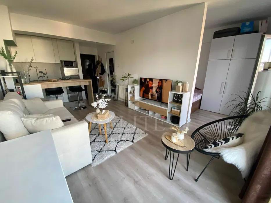 ELITE va ofera spre vanzare apartament cu o camera in construcție nouă, situat in cartierul IRIS zona CLUJANA, fiind orientat SUD EST. Apartamentul are o suprafata utila de 32 mp si este pozitionat la etajul 8, in bloc apartamente, construit in 2008, cu izolație exterioară. Este un apartament semidecomandat, confort 1, cu bucatarie open space, o baie, un balcon. In interior este finisat modern. Imobilul dispune si de centrală proprie,ferestre termopan,parchet laminat,faianta/gresie modernă,usa de intrare metalica. Un avantaj al acestui imobil este ca dispune de garaj subteran. Apartamentul dispune de o terasa de 5 mp. Este compartimentat in living open space impreuna cu bucataria, iar printr-un perete despartitor a fost creat un mic dormitor tip nisa de dormit, o baie si o terasa. Apartamentul se vinde complet mobilat si utilat.