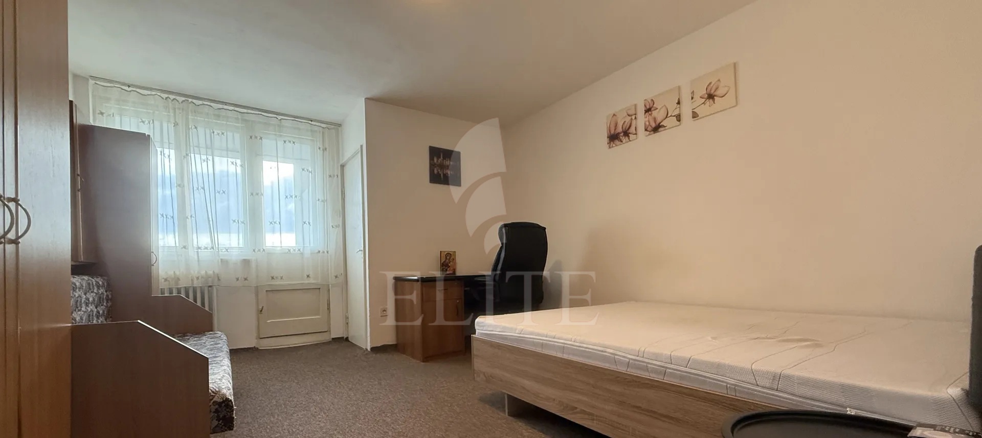 Garsoniera este situata la etaj intermediar 6/10, dispune de orientare vestica si implicit de soare pe tot parcursul zilei. Suprafata utila este de 28 m2 fiind compusa din 1 camera, hol, bucatarie, baie, camara, balcon inchis cu geamuri termopan. Dispune de finisaje medii, gresie si faianta, usa metalica la intrare, mocheta si se preda complet mobilata si utilata conform fotografiilor de prezentare (masina de spalat rufe, frigider, aragaz, cuptor cu microunde, etc.). Imobilul din care face parte dispune de o casa a scarii extrem de ingrijita si generoasa, 2 lifturi, intrare pe baza de interfon cu cartela. In imediata apropiere regasim: