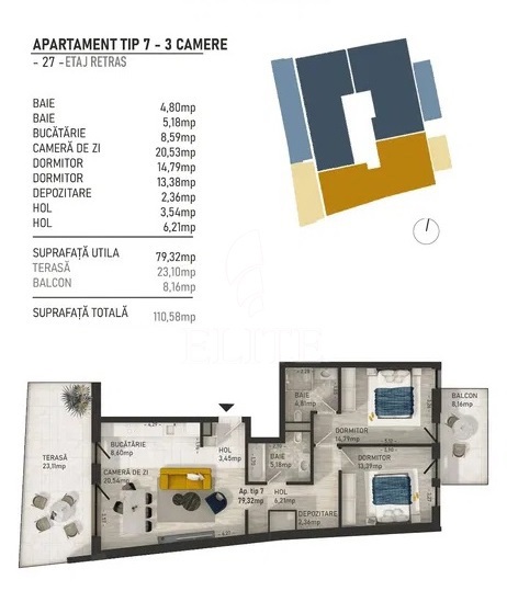ELITE offers for sale apartment with 3 rooms in new construction, located in the area CENTRALA. The apartment has an usable area of 80 mp and is positioned on the floor 5, in apartment block with height regime parter plus 5 etaje, built in 2022, exterior insulation. It is an detached apartment, confort increased, with separate kitchen, 2 bathrooms, 2 balconies. The interior is semifinisat. The property also has own central,double glazing windows, metal front door. An advantage of this property is that it has underground garage.