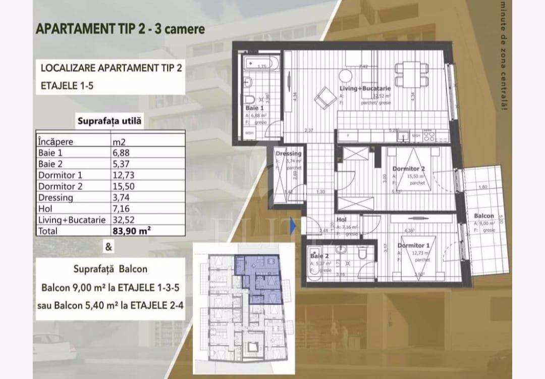 ELITE offers for sale apartment with 3 rooms in new construction, located in the neighborhood CENTRAL in the area SEMICENTRALA. The apartment has an usable area of 83.9 mp and is positioned on the floor 1, in apartment block, built in 2024, exterior insulation. It is an detached apartment, confort increased, with separate kitchen, 2 bathrooms, 2 balconies. The interior is semifinisat. The property also has own central,double glazing windows, metal front door. An advantage of this property is that it has underground garage.